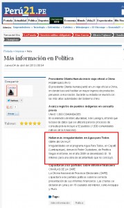 La edición online del diario Perú21.pe recoge el reportaje que emitimos el miércoles sobre las presuntas irregularidades en el programa Agua para Todos en Cayaltí, Lambayeque. La investigación es de ...